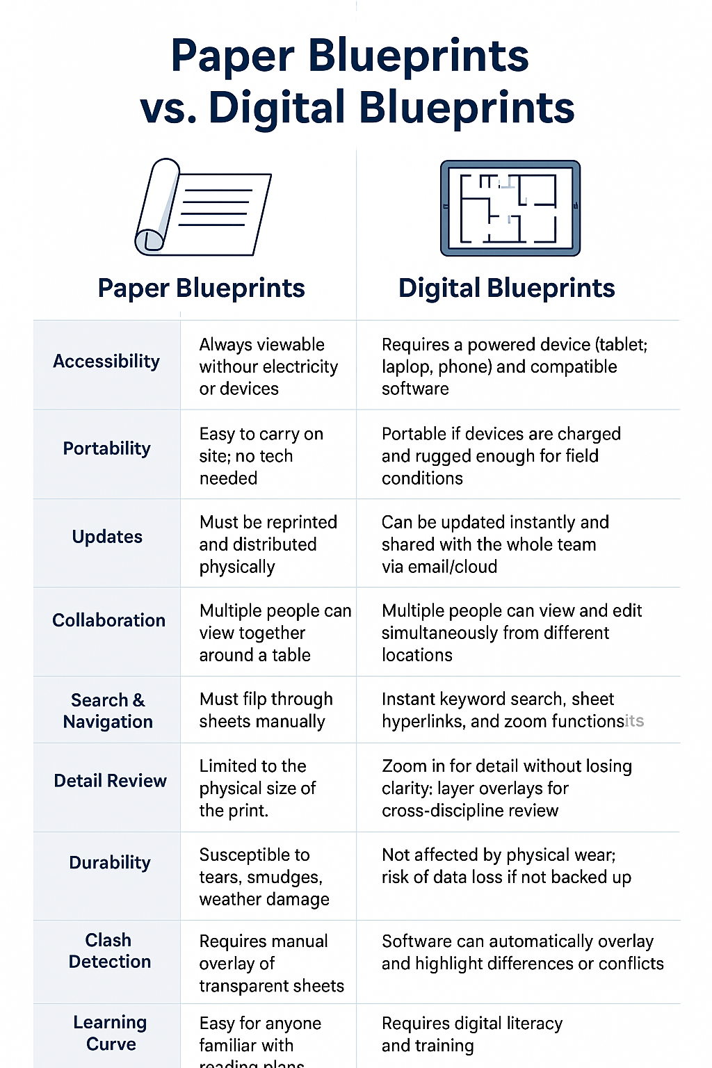In today’s construction industry, blueprints can be delivered and reviewed in two very different formats: traditional paper plans and modern digital plans. While both serve the same core purpose: to communicate the design intent and technical requirements of a project, they differ significantly in how they are accessed, managed, and used in the field. Paper blueprints are tangible, large-format drawings that can be rolled out on a table, marked up by hand, and viewed without the need for technology. They’re easy to read in bright sunlight, portable to any location, and allow multiple people to look over them at once. However, they require frequent reprinting to stay current, take up physical storage space, and are prone to wear, tear, and coffee stains. Digital blueprints, on the other hand, exist as PDF or CAD files that can be accessed through laptops, tablets, or even smartphones. They offer instant zooming for detail, quick searching for specific notes or dimensions, and the ability to overlay drawings for clash detection or compare versions to spot revisions. Updates can be shared instantly without waiting for a delivery, ensuring everyone is working from the latest version. The trade-off is that digital plans require a power source, compatible devices, and some level of technical skill to navigate. In practice, many projects use a blend of both—paper for broad field visibility and quick discussions, and digital for precision work, coordination, and keeping up with fast-moving design changes.